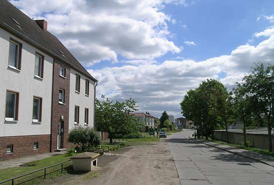 Blick Klockow. Auf der linken Straßenseite die Bahntrasse, hinten die Stettiner Chaussee.